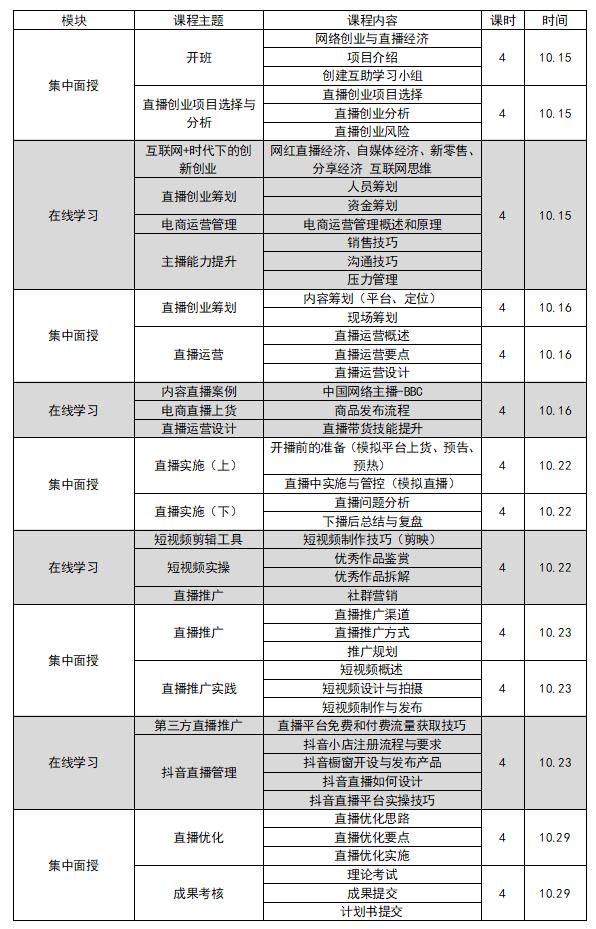 网络创业培训(直播版)课程是由杭州市人社局组织专家研发,将互联网知识与创业技能相结合的特色课程。该课程引入翻转课堂理念,采用线上+线下相结合的教学模式,旨在更好地启发学员的互联网创业意识,帮助学员精准高效掌握直播实操技能,并通过直播规划书及实践成果的提交,在实现产品营销推广和内容转化的基础上推动创业项目成功落地。培训共分为14次课,56学时,其中10次集中面授,4次在线学习,成人网