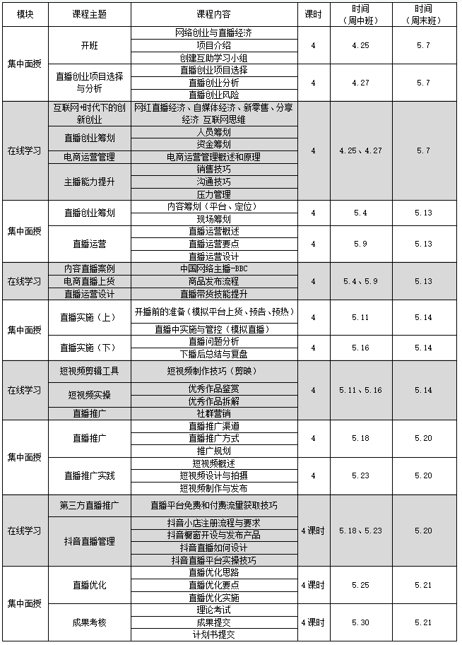 网络创业培训(直播版)课程是由杭州市人社局组织专家研发,将互联网知识与创业技能相结合的特色课程。该课程引入翻转课堂理念,采用线上+线下相结合的教学模式,旨在更好地启发学员的互联网创业意识,帮助学员精准高效掌握直播实操技能,并通过直播规划书及实践成果的提交,在实现产品营销推广和内容转化的基础上推动创业项目成功落地。培训共分为14次课,56学时,其中10次集中面授,4次在线学习,成人网