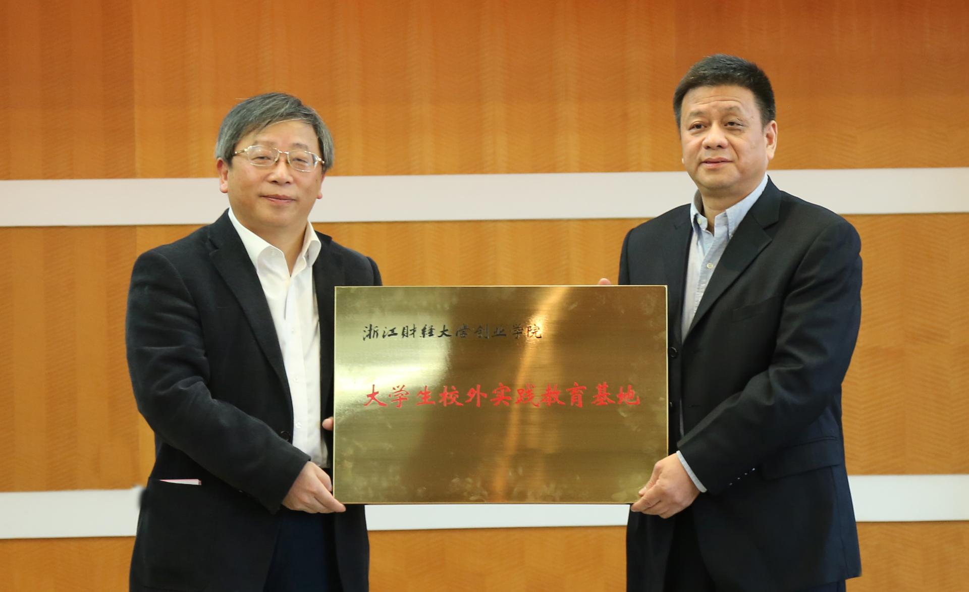 尤利群与刘祥剑分别代表双方签订合作框架协议。钟晓敏为杭州城投资本授予“大学生校外实践教育基地”牌匾,并授予刘祥剑等成人网