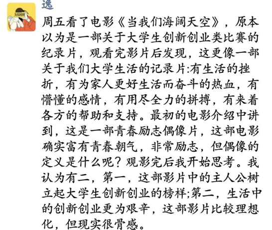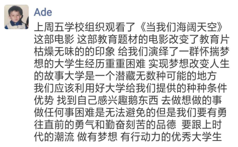 观影结束后,同学们热情澎湃,纷纷在朋友圈发表观影感言。大家被主人公坚定不懈的意志所撼动,同时也对创新创业活动有了更深入的认识:创业不是只意味着运气,这是汗水、智慧与团结的结合。以下是同学们在朋友圈发的观影感言: