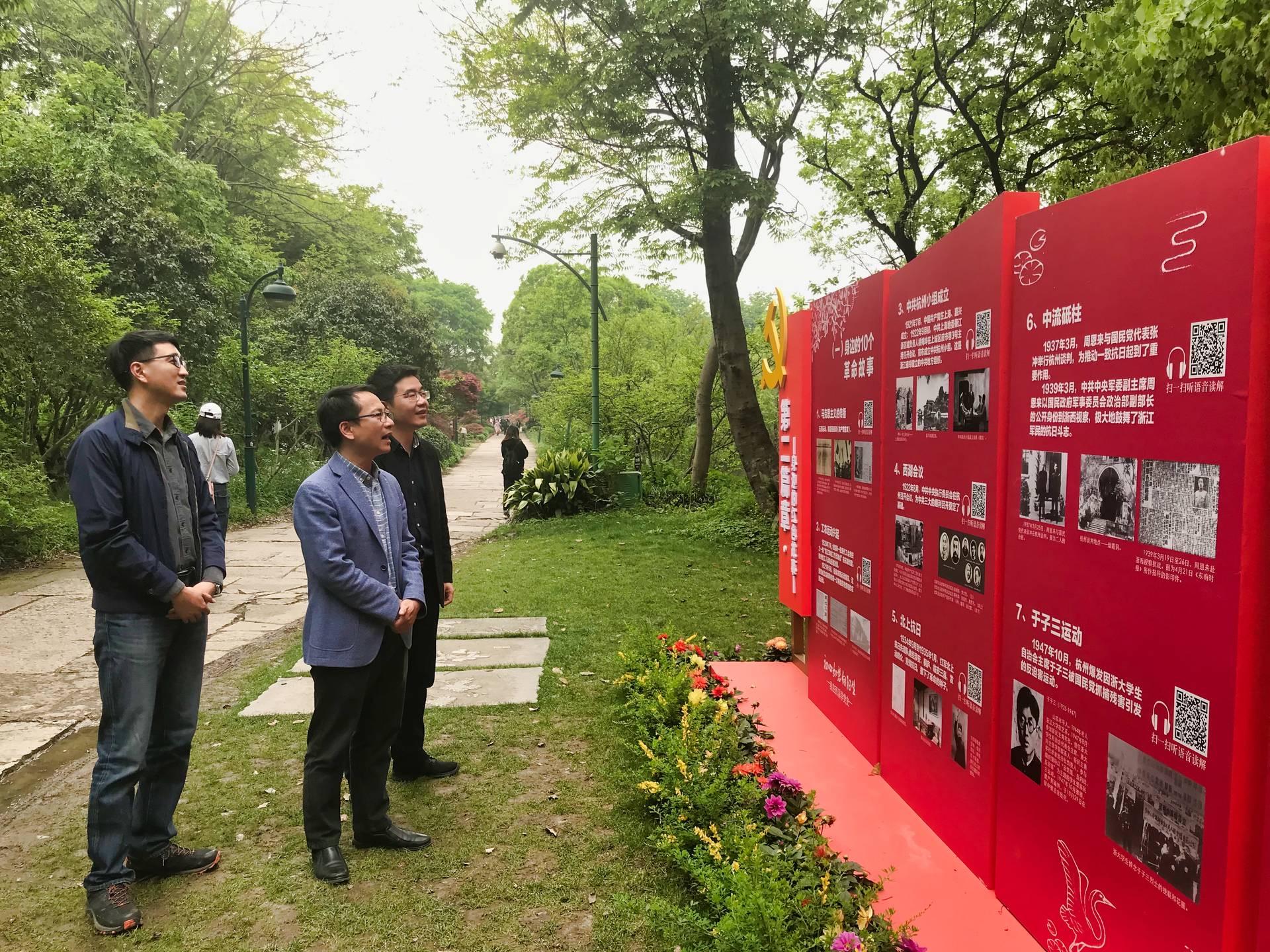 在深入学习习近平总书记讲话精神后,党员同志们实地考察,沿着林荫小道,重走总书记走过的路线,欣赏着绿水盈盈、百花盛开的湿地美景。党员同志们在观看“双西”一体化视频后,一路上学习了 “身边的10个改革故事”等党史主题宣传教育展示,了解了杭州改革发展、艰苦创业的故事,领悟老一辈先驱锐意进取、不屈不挠的革命精神,进一步坚定理想信念。