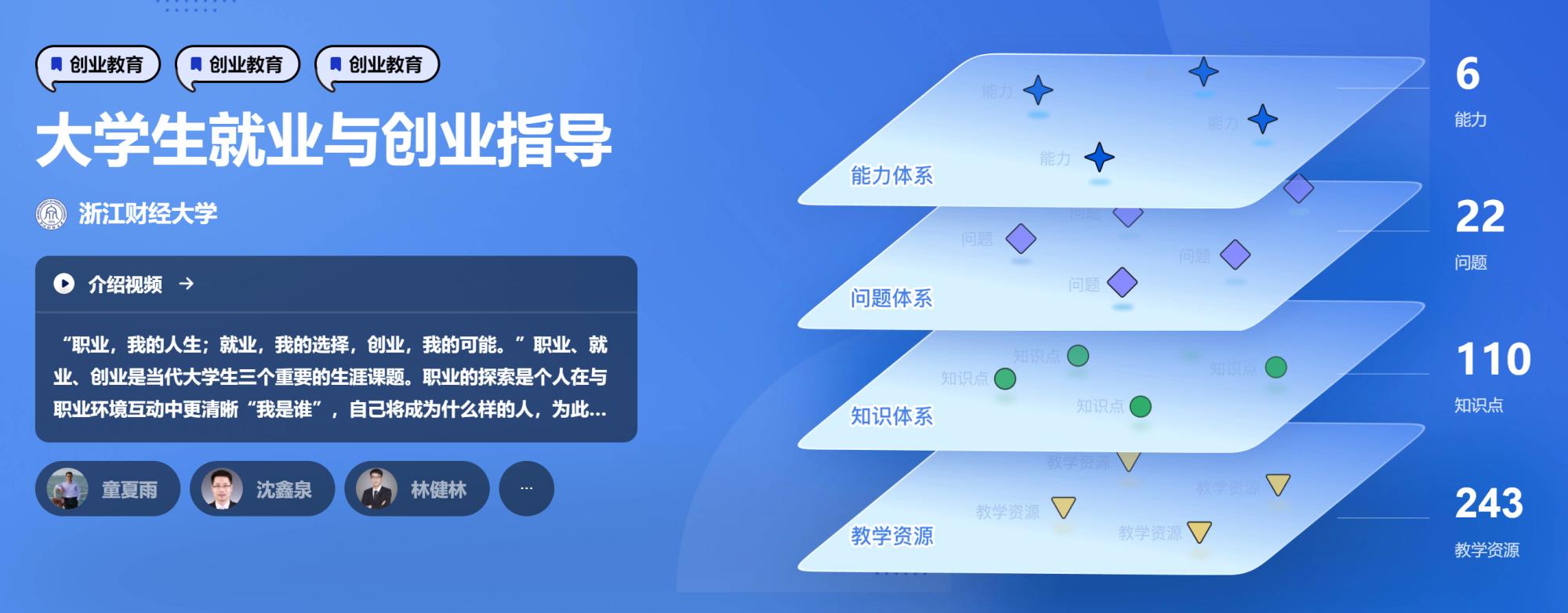 目前上线的标准课程版本中,《大学生就业与创业指导》共建立起6个能力层次、研究出22个问题体系,建构110个知识点和151个知识关系,《创业基础》共梳理出8项能力层次、78个知识点,构建起77个知识关系,链接146项教学资源。