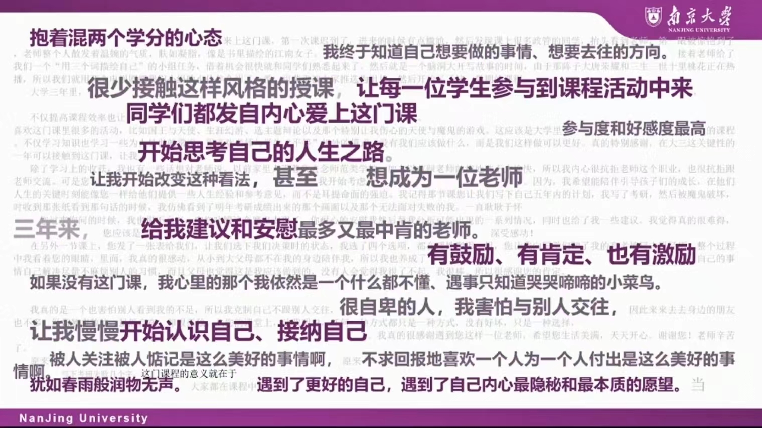 其次刘老师还提到就业指导原则、生涯教育目标及教学任务体现了生涯教育课程的学习要求。她提倡体验式、个性化、输出性、演练式的教学模式,重视学生在课堂中的参与度。不仅如此,她还鼓励学生通过评分表在课后进行自我评估,在不断地复盘中了解自己。