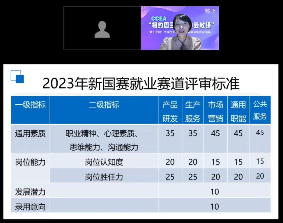 最后,阮娟围绕作品材料与参赛准备分享了指导技巧。她建议作品材料在构成上需要打破时间线,明确重点,全线贯彻专门模块评分标准。现场展示要营造故事感、设计感、价值感,注重导入环节,强调目标职业的社会价值。