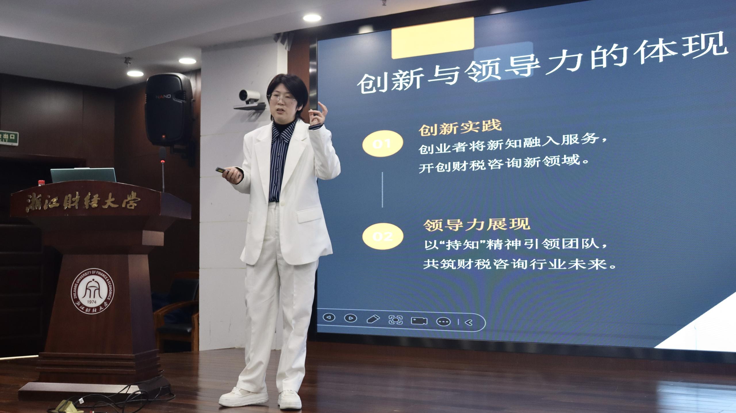 冯月维女士从创业的背景、创业者品质、创业风险、创业建议及企业的收获五个维度深入剖析了创业历程,她首先分析了数字经济时代的的财税咨询挑战与行业痛点,并分享了自己在人生规划革新中选择创业的故事。并结合当下大学生的日常生活,强调了创业者应具备坚韧不拔、创新与领导力、责任感与风险应对等品质,并特别指出“持续学习”是区分长期创业与短期项目的关键。