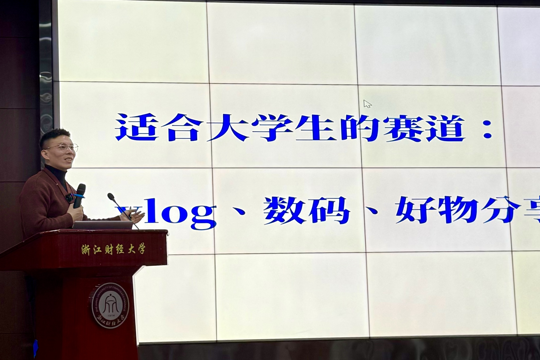 首期课程以“从0到1,玩转内容变现”为主题,特邀两位优秀平台博主担任主讲嘉宾。教育博主漫漫Mansi以“道心是IP底色,能力是必要条件,愿力是天花板”为核心,结合自身成长经历,阐述了内容创作的思维方法与个人价值定位,引导同学们培养互联网思维。数码家居博主大勺子聚焦垂直内容,通过“系列选题”“对标账号拆解”等方法,已打造出多篇爆款笔记。他介绍并系统拆解了接广告、技能变现、带货佣金、开店卖货等四种适合大学生的商业变现路径,为同学们提供了清晰的变现地图。