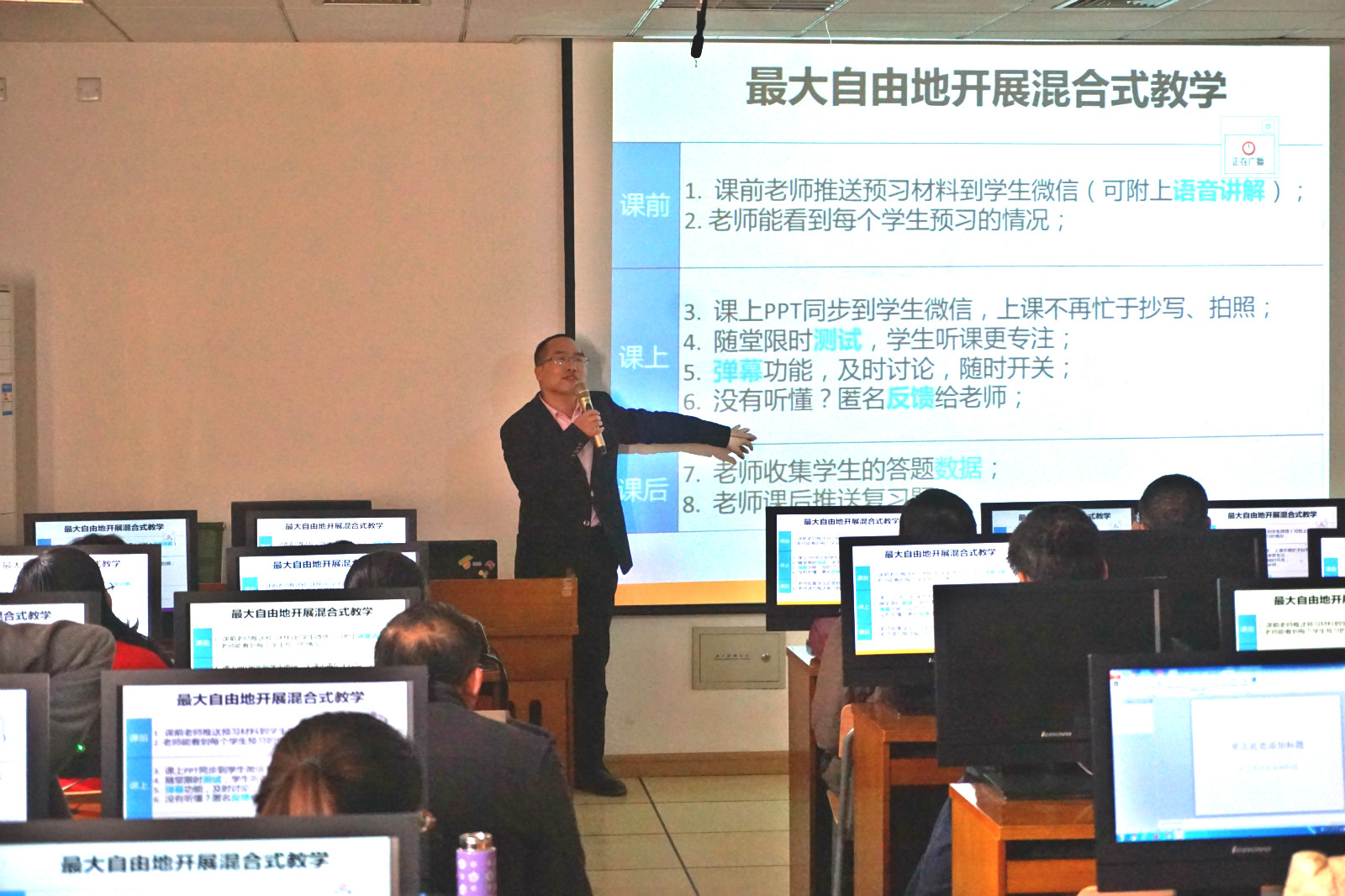 丁又专博士的培训分为雨课堂基本功能介绍、雨课堂实操演示、互动交流这个三个部分,整个培训环节采取“雨课堂”授课模式,参加培训的老师通过扫描二维码加入于博士的微信课堂,参与在线测试、现场答题统计、现场调查、发送点评或弹幕到投影屏幕,有效展示了“雨课堂”良好的课堂互动、及时的授课反馈和多样的授课形式等特点。培训结束后,老师们们对如何使用雨课堂、雨课堂会对自己的课程带来哪些挑战等方面进行了提问,丁又专博士都一一进行了解答。