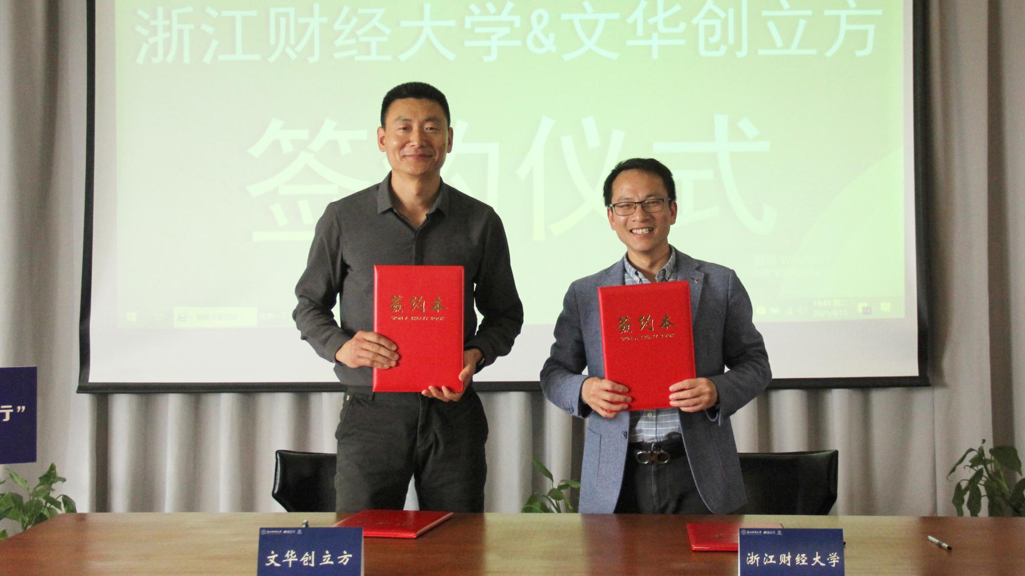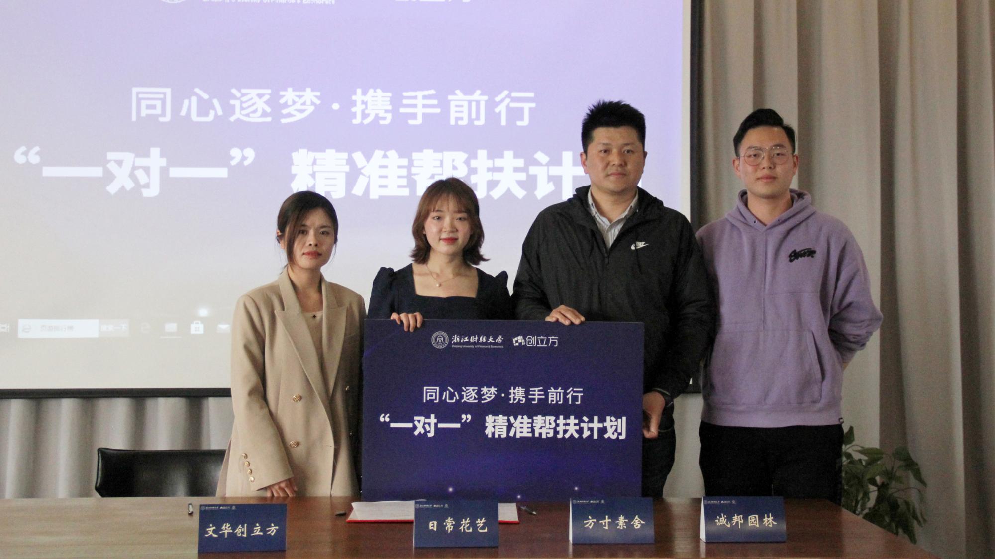 与创立方资源共享、优势互补、互利互赢的合作机制,让更多大学生的创新创业之梦在这里扬帆起航,企业代表文华创立方、诚邦园林,学生创业项目代表方寸素舍、日常花艺,上台共同签署一对一帮扶计划合作书。
