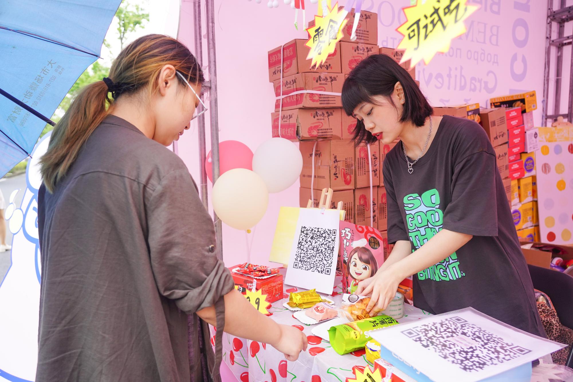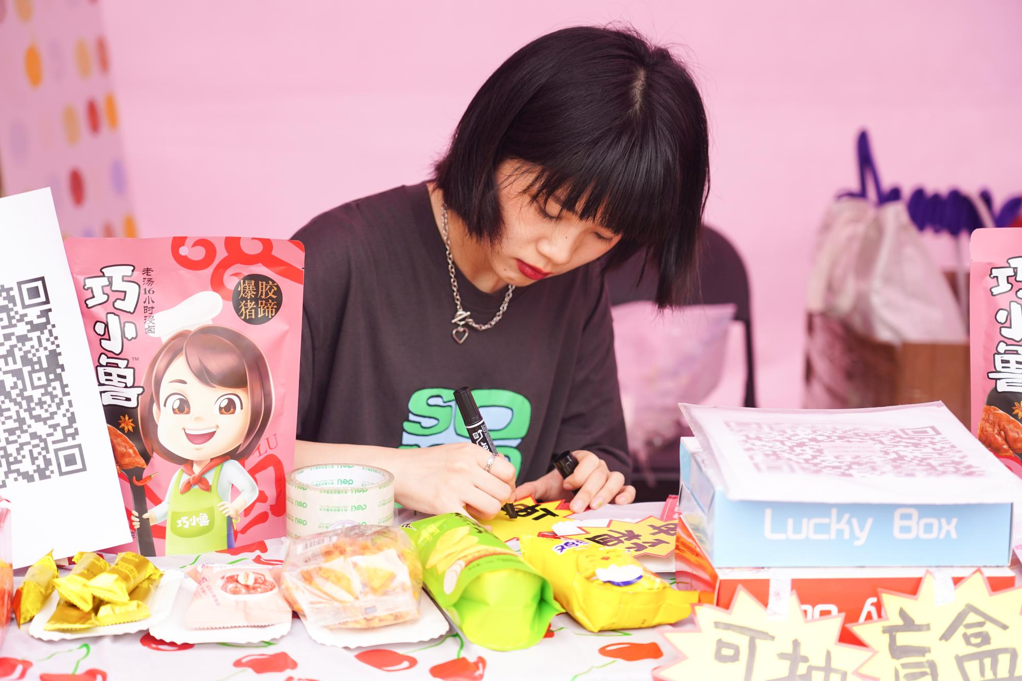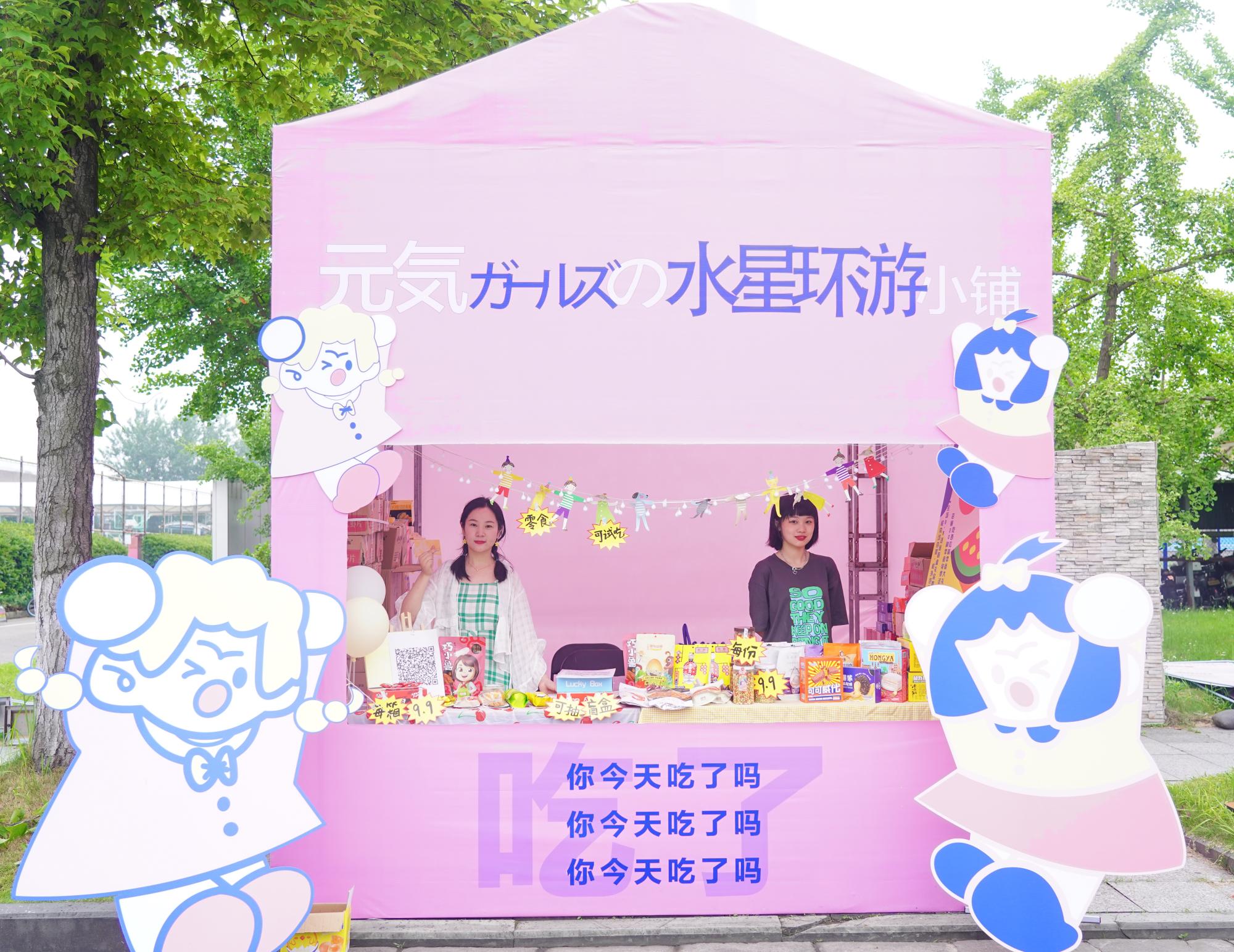 以售卖好吃实惠的小零食为主题,元気ガールズの水星环游小铺依据大学生的口味和需求,精心挑选了包括薯片、卤味、素食等在内的20多种零食商品,并通过游戏和比赛的方式,准备了盲盒、红包等小礼品作为活动福利,吸引了众多来往的同学围观购买,单日销售收入破千。