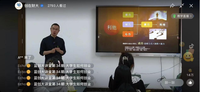 主办、绘梦蓝创空间承办的第34期蓝创大讲堂在线上线下同时顺利举行,全校2800余名学生聆听了讲座。本期蓝创大讲堂的主题是“大学生如何创业”,蓝城检测集团总裁、成人网